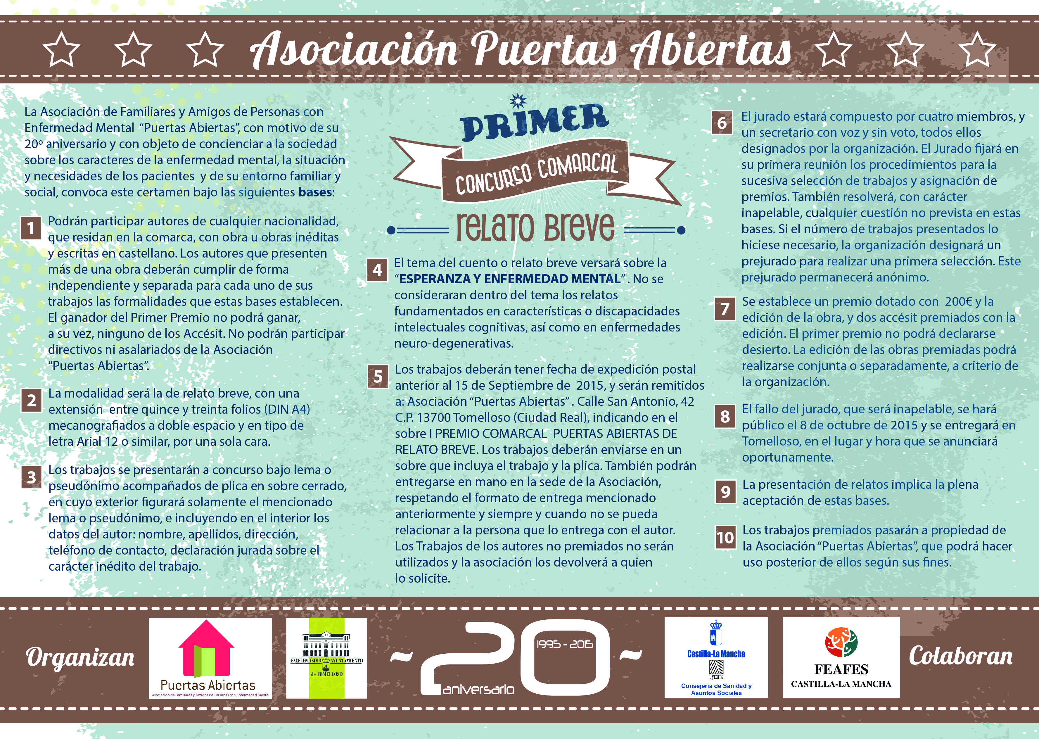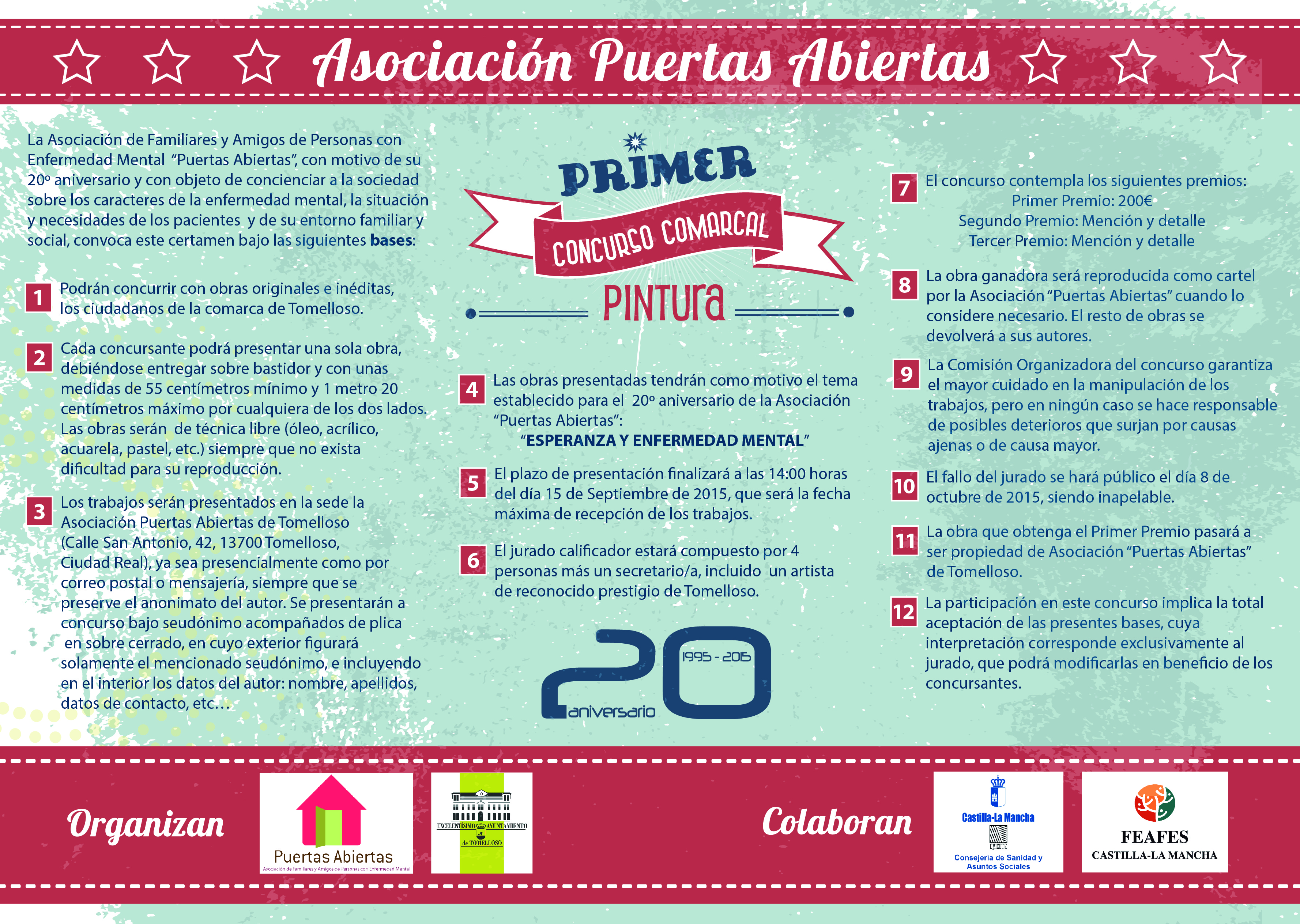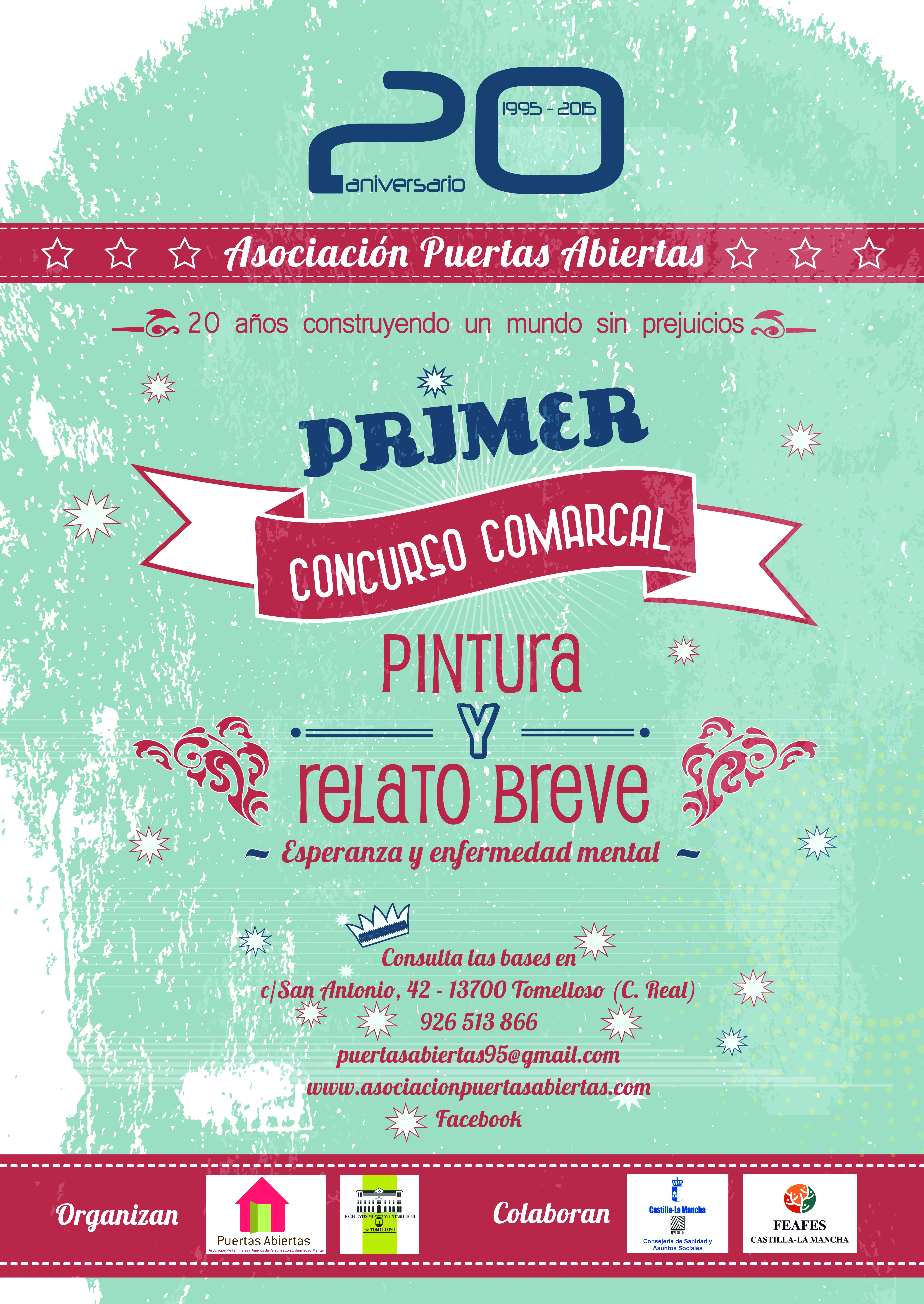 Con motivo del 20 º aniversario, Asociación Puertas Abiertas convoca por primera vez dos concursos artísticos, uno de pintura y otro de relatos breves. El objetivo es recoger la imagen que tiene la sociedad de la enfermedad mental y su recuperación así como de la salud mental en general, y por otra parte sensibilizar y dar conciencia de lo importante que es dotar de esperanza a las personas que sufren cualquier enfermedad mental y a sus familiares.